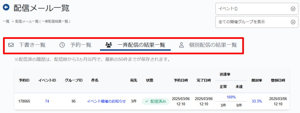 配信メール一覧で、イベントと開催グループで絞り込み表示ができるようになりました。